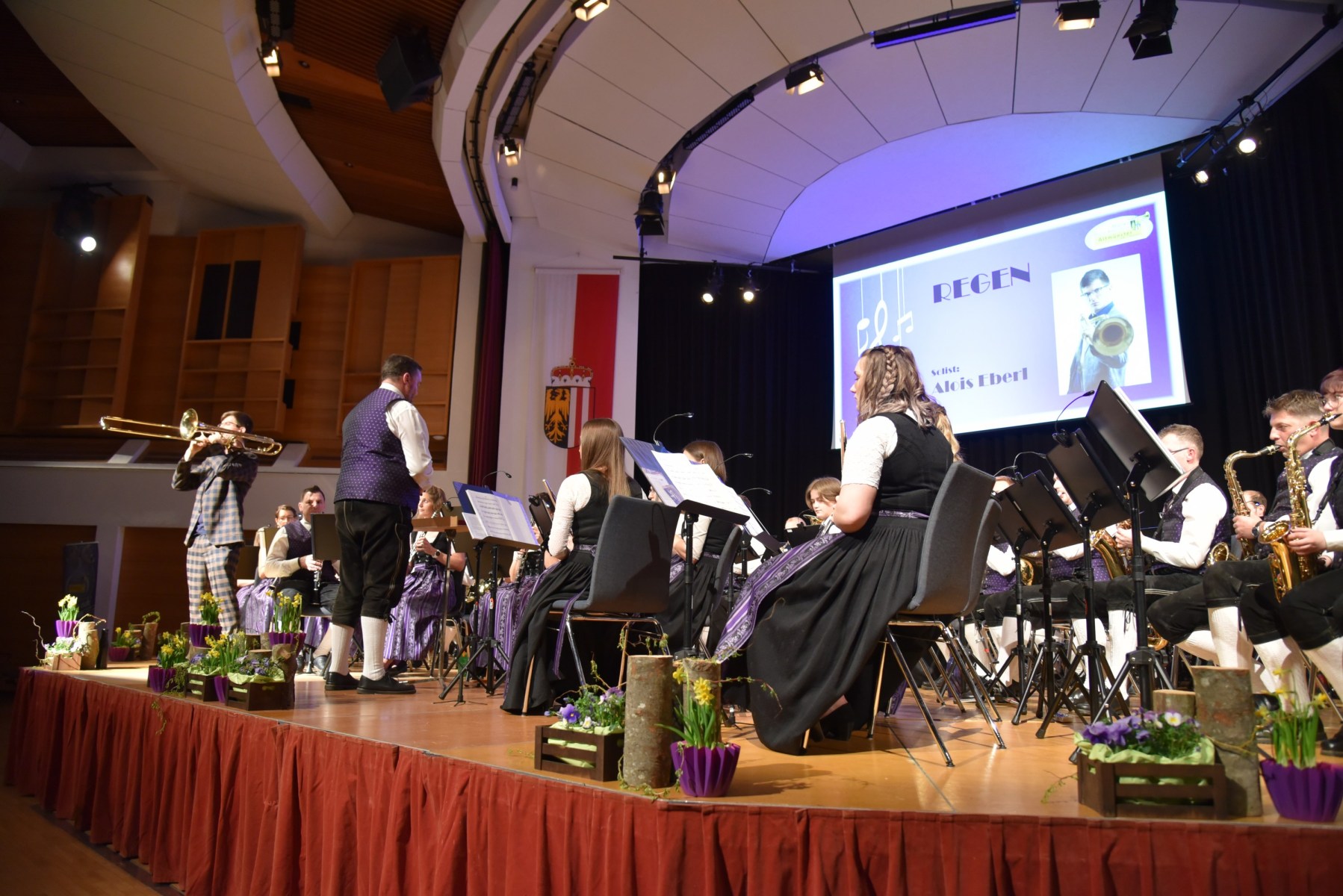 Der zweite Teil begann mit dem eigens für dieses Konzert von Daniel Holzleitner komponierte Stück „Regen“. Alois Eberl verzauberte bei dieser Uraufführung wiederum mit seinem Posaunenspiel das Publikum. Neben interessanten Fakten zu den gespielten Stücken sorgten die beiden Sprecherinnen Christina Göschlberger und Alexandra Pesendorfer immer wieder mit kurzweiligen und lustigen Geschichten für gute Stimmung.