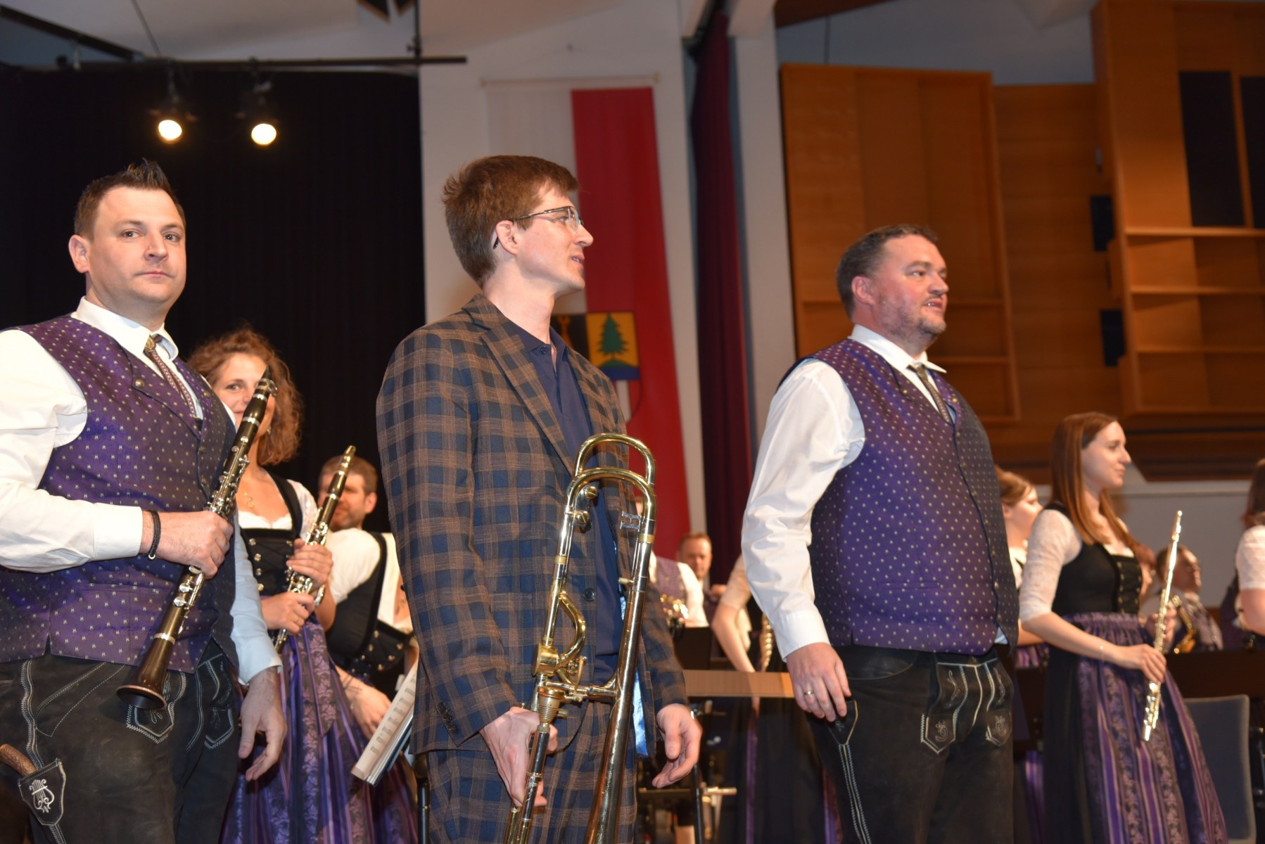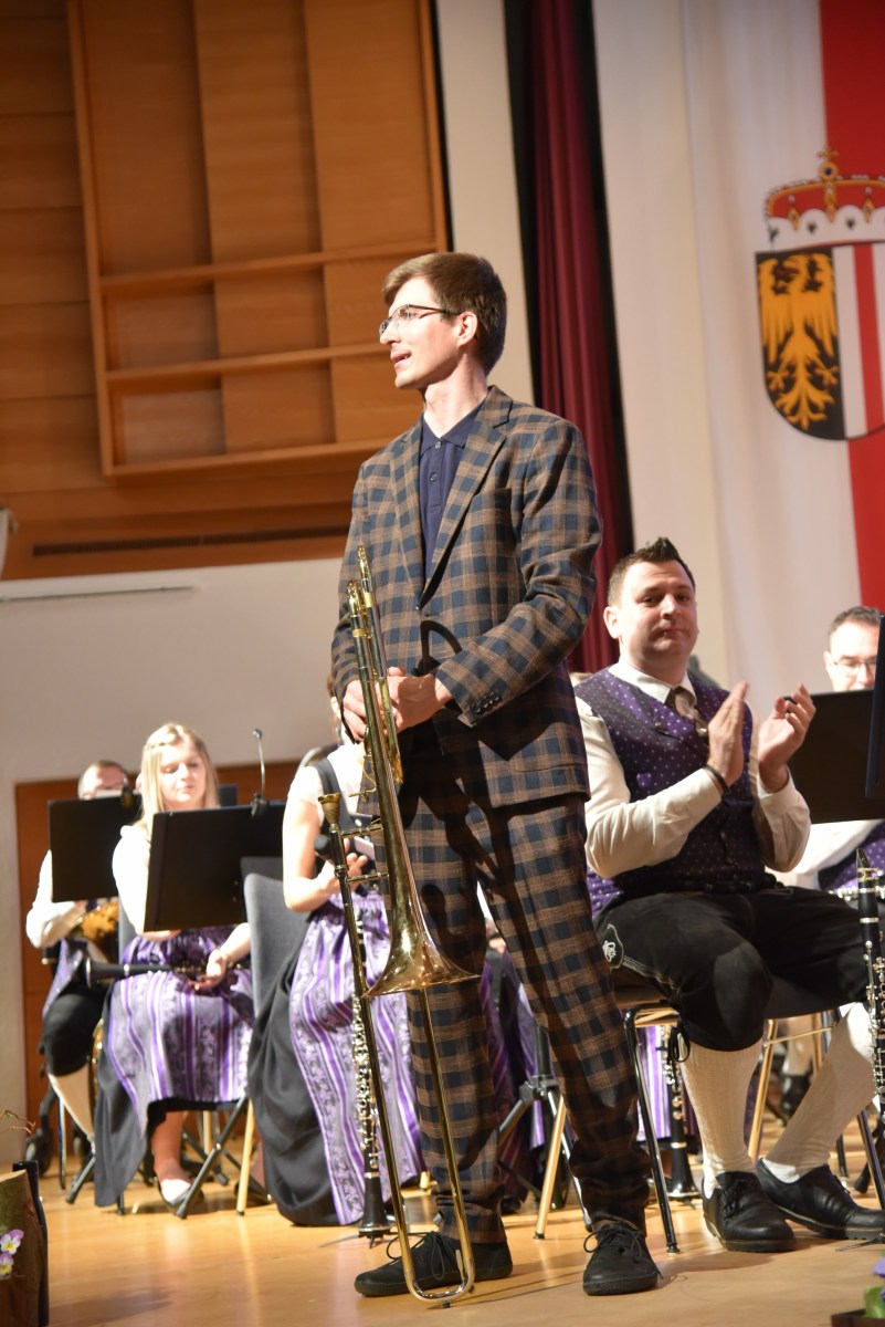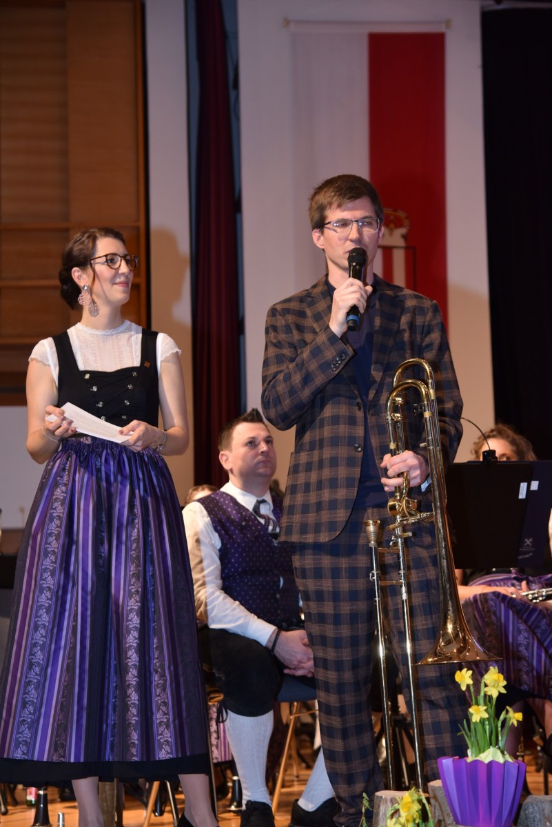 Nach dem Auftakt, „Into the Empire“ von Michael Geisler und dem heurigem Konzertwertungs-Pflichtstück „Magic Moments“ von Fritz Neuböck folgte das erste Highlight des Abends: „Konzert für Posaune“ von Friedebald Gräfe. Dabei glänzte zum ersten Mal der Solist Alois Eberl. Der in Kitzbühel geborene Posaunist, Akkordeonist und Komponist und die ehemalige Oboistin des Marktmusikvereins Anna Lang leben seit 15 Jahren gemeinsam in Altmünster. Das makellos gespielte Posaunensolo wurde gekonnt dezent vom Orchester begleitet. Der Marsch „Wir sind Helden“ von Sebastian Schraml bildete den Abschluss des ersten Teils.